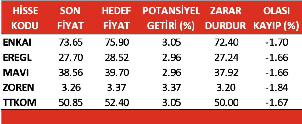 Alnus Yatırım'ın günlük hisse önerileri listesinde 5 hisse paylaşıldı. Bunlar; ENKAI, EREGL, MAVI, ZOREN ve TTKOM hisseleri oldu. Hisselere ait hedef fiyat duyuran aracı kurum, yükseliş potansiyellerini de duyurdu. Günlük hisse arayan yatırımcılar, bu hisseleri izlemeye alabilir.