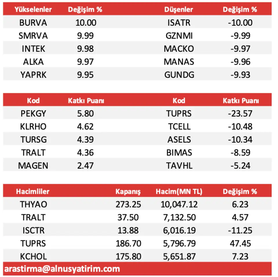 - "Dünkü işlem gününe BİST-100 endeksi; 13,69 puanlık yükselişle başladı. Ancak, açılış sonrasında satış baskısı içerisine giren endekste; gün içerisinde geri çekilmelerin derinleşmesiyle 11.308,98 puan seviyesi test edildi ve seansın sonunu da; yüzde 0,94 oranındaki düşüşle, 11.348,83 puandan noktaladık. Endeksin işlem hacmi; önceki günkü 127,4 Milyar TL düzeyinden 122,5 Milyar TL’ye geriledi. Endekse puan bazında en fazla negatif etki eden şirket hisseleri; 23,57 puan ile TUPRS, 10,48 puan ile TCELL ve 10,34 puan ile ASELS oldu."