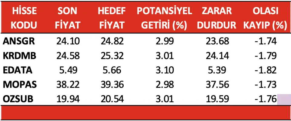 Alnus Yatırım'ın günlük hisse öneri listesinde 5 yeni hisse açıklandı. Bunlar; ANSGR, KRDMB, EDATA, MOPAS ve OZSUB hisseleri oldu. Hisselere ait hedef fiyat, potansiyel getiri, zarar durdur ve olası kayıp verileri de paylaşıldı.