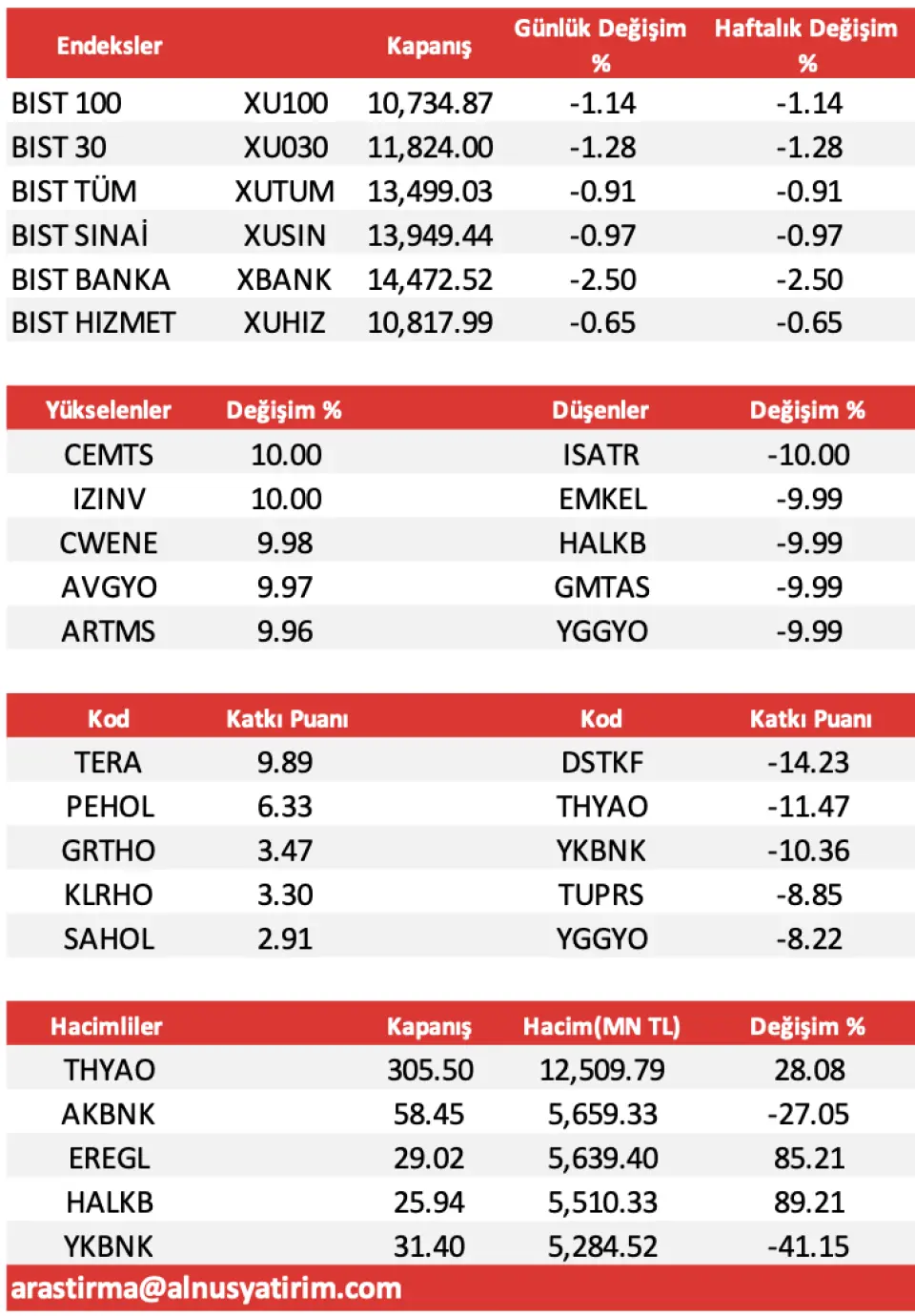 "Yeni haftanın ilk işlem gününe BİST-100 endeksi; 26,35 puanlık yükselişle başladı. Açılıştan sonra yukarı tarafta 10.928,38 puan seviyesi test edilirken, sonrasında yeniden satış baskısı ortaya çıktı. Seansın sonunu da; yüzde 1,14 oranındaki düşüşle 10.734,87 puandan noktaladığımız BİST-100 endeksinin, işlem hacmi; geçtiğimiz güne göre 9,7 Milyar TL civarındaki azalışla 117,7 Milyar TL civarında gerçekleşti. Endekse puan bazında en fazla negatif etki eden şirket hisseleri ise; 14,23 puan ile DSTKF, 11,47 puan ile THYAO ve 10,36 puan ile YKBNK olarak karşımıza çıktı.