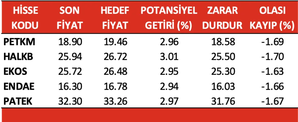Alnus Yatırım'ın yatırımcıları için duyurduğu günlük hisse senedi önerileri dikkat çekti. Bu hisselere yönelik hedef fiyatla birlikte potansiyel getiri seviyeleri de paylaşıldı. Hisseler; PETKM, HALKB, EKOS, ENDAE ve PATEK oldu.