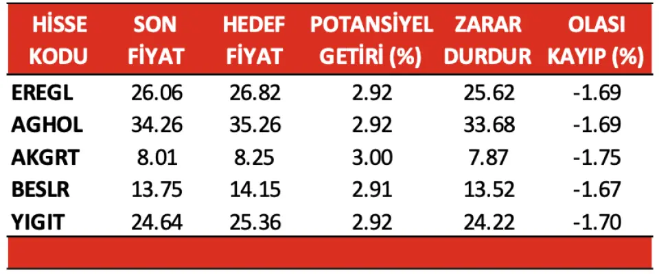 Alnus Yatırım günlük hisse senedi tavsiyesi listesinde yine 5 hisseyi paylaştı. Bunlar; EREGL, AGHOL, AKGRT, BESLR ve YIGIT hisseleri oldu. Bu hisselere ait son ve hedef fiyat paylaşılırken, potansiyel getiri, zarar durdur ve olası kayıp seviyelerine de yer verildi.