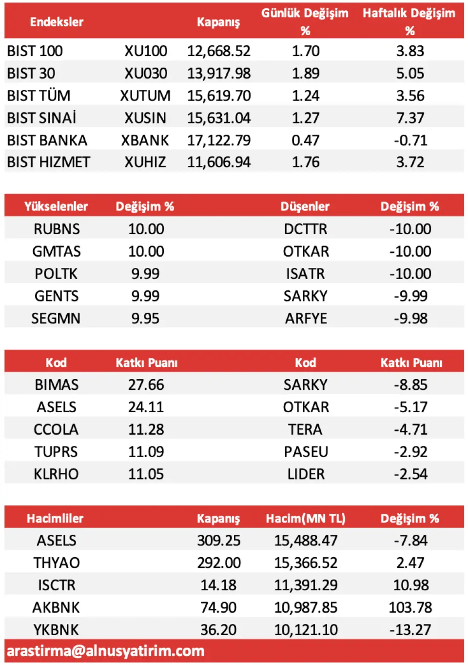 - "BİST-100 endeksi, geçtiğimiz haftanın son işlem gününe; 29,84 puanlık yükselişle başladı. Gün içerisinde alımların hızlanmasıyla 12.668,52 puan ile tüm zamanların en yüksek seviyesi yenilendi. Seansın sonunu da, yüzde 1,70 oranındaki yükselişle aynı puandan(12.668,52) yeni bir kapanış rekoru kırarak noktaladık. Endeksin işlem hacmi; önceki günkü 175,9 Milyar TL düzeyinden, 24 Ekim 2025’den bu yana en yüksek seviye olan 194,3 Milyar TL’ye yükseldi. Puan bazında endekse en fazla pozitif etki eden şirkethisseleri; 27,66 puan ile BIMAS, 24,11 puan ile ASELS ve 11,28 puan ile CCOLA oldu."