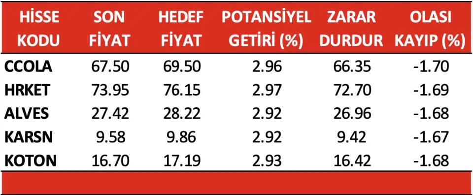 Alnus Yatırım'ın günlük hisse seneleri arasında CCOLA, HRKET, ALVES, KARSN ve KOTON yer aldı. Hisselere ait son fiyat, hedef fiyat, potansiyel getiri, zarar durdur ve olası kayıp seviyeleri de paylaşıldı.