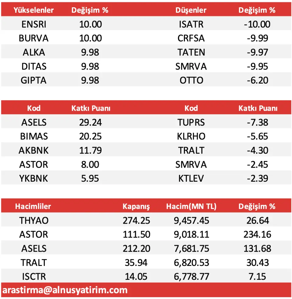 - "Yeni haftanın ilk işlem gününe BİST-100 endeksi, 37,92 puanlık yükselişle başladı. Gün içerisinde yukarı yönlü atakların ivme kazandığı endekste, seansın sonunu da; yüzde 1,28 oranındaki yükselişle 11.456,34 puandan noktaladık. Endeksin işlem hacmi; önceki günkü 111,3 Milyar TL düzeyinden 127,4 Milyar TL’ye yükseldi. Endekse puan bazında en fazla pozitif etki eden şirket hisseleri; 29,24 puan ile ASELS, 20,25 puan ile BIMAS ve 11,79 puan ile AKBNK oldu."