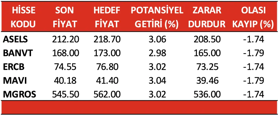 Alnus Yatırım hisse önerilerini 16 Aralık 2025 tarihinde de paylaştı. Bunlar; ASELS, BANVT, ERCB, MAVI ve MGROS hisseleri oldu. Hisselere ilişkin hedef fiyatlar, potansiyel getiriler açıklanırken zarar durdur ve olası kayıp verilerine de yer verildi.