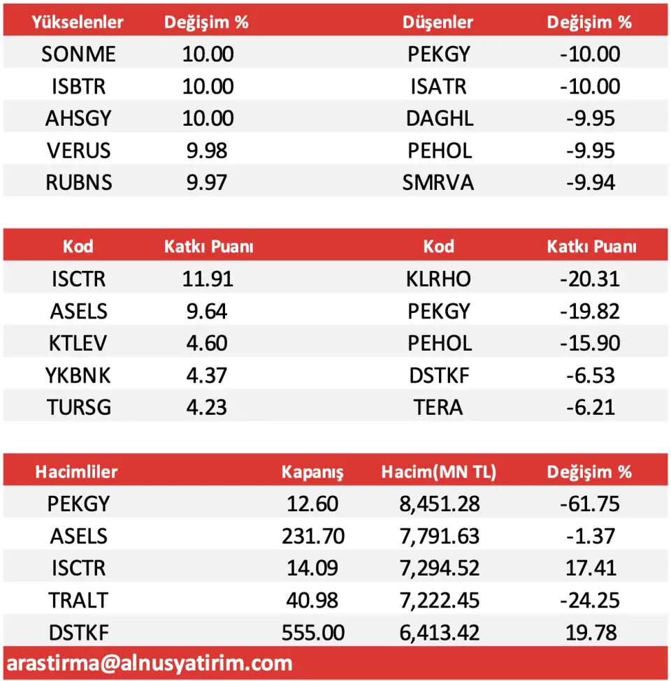 - "BİST-100 endeksi, yılbaşı tatili öncesindeki son işlem gününe; 29,50 puanlık yükselişle başladı. Takas avantajının da olduğu günde, yükseliş hareketinin devamında yukarı tarafta 11.324,36 puan seviyesi test edildi. Ancak, kapanışa doğru geri çekilmeler ortaya çıktı ve yüzde 0,37 oranındaki daha sınırlı artışla,11.260,52 puandan seansı noktaladık. Endeksin işlem hacmi ise; önceki günkü 114,8 Milyar TL düzeyinden 112,6 Milyar TL’ye kısmen geriledi. Endekse puan bazında en fazla pozitif etki eden şirket hisseleri; 11,91 puan ile ISCTR, 9,64 puan ile ASELS ve 4,60 puan ile KTLEV oldu."