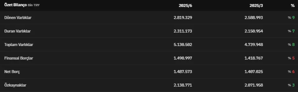 Dönen varlıklar 2025 yılının ikinci çeyreğinde 2.819.329.000 TL olarak açıklandı. 2025 yılının ilk çeyreğinde 2.588.993.000 TL olarak açıklanan dönen varlıklar, yılın ikinci çeyreğinde %9 artmış oldu. 2025 yılının ikinci çeyreğinde 2.311.173.000 TL olarak açıklanan duran varlıklar ise, 2025 yılının ilk çeyreğinde 2.150.954.000 TL olarak açıklanmıştı. Toplam varlıklar 2025 yılının ikinci çeyreğinde 5.130.502.000 TL olarak kaydedildi. 2025 yılının ilk çeyreğinde 4.739.948.000 TL olarak açıklanan toplam varlıklar, 2025 yılının ikinci çeyreğinde %8 artmış oldu.Finansal borçlar 2025 yılının ikinci çeyreğinde 1.490.997.000 TL olarak açıklandı. 2025 yılının ilk çeyreğinde 1.418.767.000 TL olarak açıklanan finansal borçlar, 2025 yılının ikinci çeyreğinde %5 artmış oldu. 2025 yılının ikinci çeyreğinde net borç 1.487.573.000 TL olarak açıklandı. 2025 yılının ilk çeyreğinde 1.407.025.000 TL olarak açıklanan net borç, 2025 yılının ikinci çeyreğinde %6 artmış oldu. Özkaynaklar ise 2025 yılının ikinci çeyreğinde 2.138.771.000 TL olarak duyuruldu. 2025 yılının ilk çeyreğinde 2.071.958.000 TL olarak açıklanan özkaynaklar, 2025 yılının ikinci çeyreğinde %3 artmış oldu.