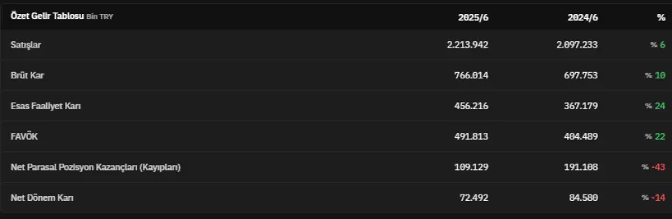 Şirket 2025 yılının ikinci çeyreğinde 2.213.942.000 TL satış gerçekleştirdi. 2024 yılının aynı dönemine oranla satış geliri %6 arttı. 2024 yılının ikinci çeyreğinde satışlar 2.097.233.000 TL olarak kayıtlara geçmişti. 2025 yılının ikinci çeyreğinde brüt kar 766.014.000 TL olarak açıklandı. 2024 yılının ikinci çeyreğinde ise bu veri 697.753.000 TL olarak açıklanmıştı. Böylece ilgili veri 2025 yılının ikinci çeyreğinde, 2024 yılının ikinci çeyreğine kıyasla %10 artmış oldu.Esas faaliyet karını 456.216.000 TL olarak açıklayan şirket, 2024 yılının ikinci çeyreğinde esas faaliyet karını 367.179.000 TL olarak açıklamıştı. Böylece ilgili veri, 2025 yılının ikinci çeyreğinde, 2024 yılının ikinci çeyreğine kıyasla %24 artmış oldu. FAVÖK 2025 yılının ikinci çeyreğinde 491.813.000 TL olarak açıklandı. 2024 yılının ikinci çeyreğinde 404.489.000 TL olarak açıklanan FAVÖK, 2025 yılının ikinci çeyreğinde %22 artmış oldu. Net Parasal Pozisyon Kazançları (Kayıpları) 2025 yılının ikinci çeyreğinde 109.129.000 TL olarak açıklandı. Net dönem kârı ise 72.492.000 TL olarak kaydedildi. İlgili veri 2024 yılının ikinci çeyreğinde 84.580.000 TL olarak açıklanmıştı.