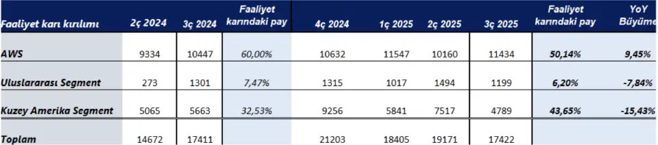 AWS'de büyümenin son çeyrekte tekrar %20 üzerine çıkması, kapasite artışları ile büyümenin önümüzdeki çeyreklerde daha da ivmeleneceği beklentimiz (~%24)