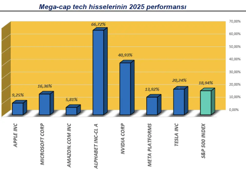 Amazon 2025 senesi boyunca model portföyümüzde yer alırken, portföyde en zayıf performansı (+%5) gösteren hisselerden bir tanesiydi. Harika Yedili arasında portföyde tuttuğumuz diğer iki hisse ise Alphabet (+%66) ve Nvidia (+%36) toplam getiri anlamında hem grubun hem de S&P 500 endeksinin kazandıran hisseleri arasındaydı.