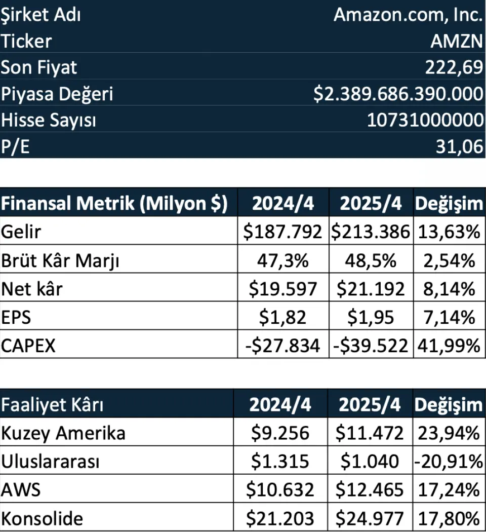 AMZN Net Satışları 4Ç25'te, Yıllık %14 Artışla 213,4 Milyar Dolara Ulaştı! Pusula Yatırım Yayınladığı Raporunda Amazon 4. Çeyrek 2025 Finansal Sonuçlarını Analiz Etti. İşte Detaylar...