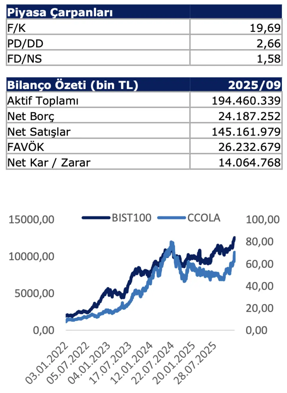 Aracı kurum şirketin, gelir büyüme yönetimi (RGM) odaklı fiyatlama yaklaşımını, ürün- paket karması optimizasyonu ve kanal bazlı yönetim uygulamaları sayesinde gelir kalitesini arttırmayı hedeflediğini aktardı. CCOLA'nın 3Ç25 döneminde net satışlarının yıllık bazda %6,7 yükselerek 52,2 milyar TL seviyesine ulaştığını belirten kurum; şatış büyümesi, fiyatlama disiplini ve hacim katkısının devam ettiğine dikkat çekti.