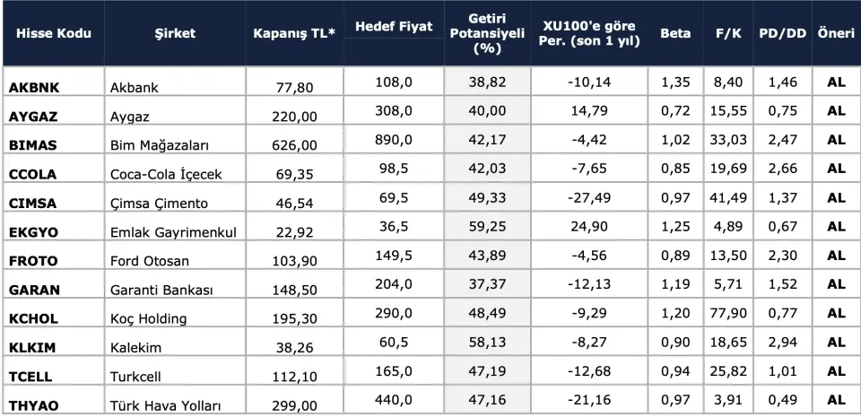 Anadolu Yatırım'ın model portföyünde 12 hisse yer aldı. Hisselere ait hedef fiyat, getiri potansiyeli, XU100'e göre son 1 yıllık performans verileri, beta, f/k, PD/DD ve hisse önerileri paylaşıldı.