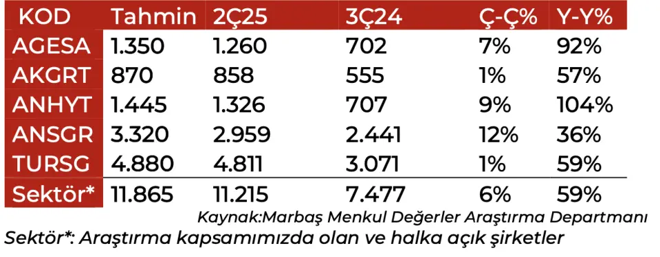 2025 yılı 3.çeyrek özelinde kar tahminlerimiz aşağıdaki gibidir: