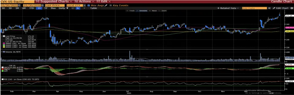 Temel tarafta ise bugün açıklanacak dördüncü çeyrek finansal sonuçlar öncesinde odak noktası, Venezuela'daki faaliyetlere ilişkin stratejik duruş ve düşük petrol fiyatlarının kârlılık üzerindeki etkisi olmaya devam ediyor; Brent petrol fiyatlarındaki yıllık bazdaki yaklaşık 10 dolarlık gerileme sonuçlar üzerinde baskı unsuru yaratırken, temettü artışı beklentisi ve güçlü nakit akışı öngörüleri bu etkiyi kısmen dengeleyebilir. 345 milyar dolar piyasa değerine sahip Chevron için analistlerin büyük çoğunluğunun "Al" yönündeki tavsiyelerini koruması ve hissenin yıl başından bu yana sergilediği güçlü performans, kısa vadeli dalgalanma risklerine rağmen orta vadeli görünümün yapıcı kaldığını ve yatırımcı güveninin sürdüğünü ortaya koyuyor.