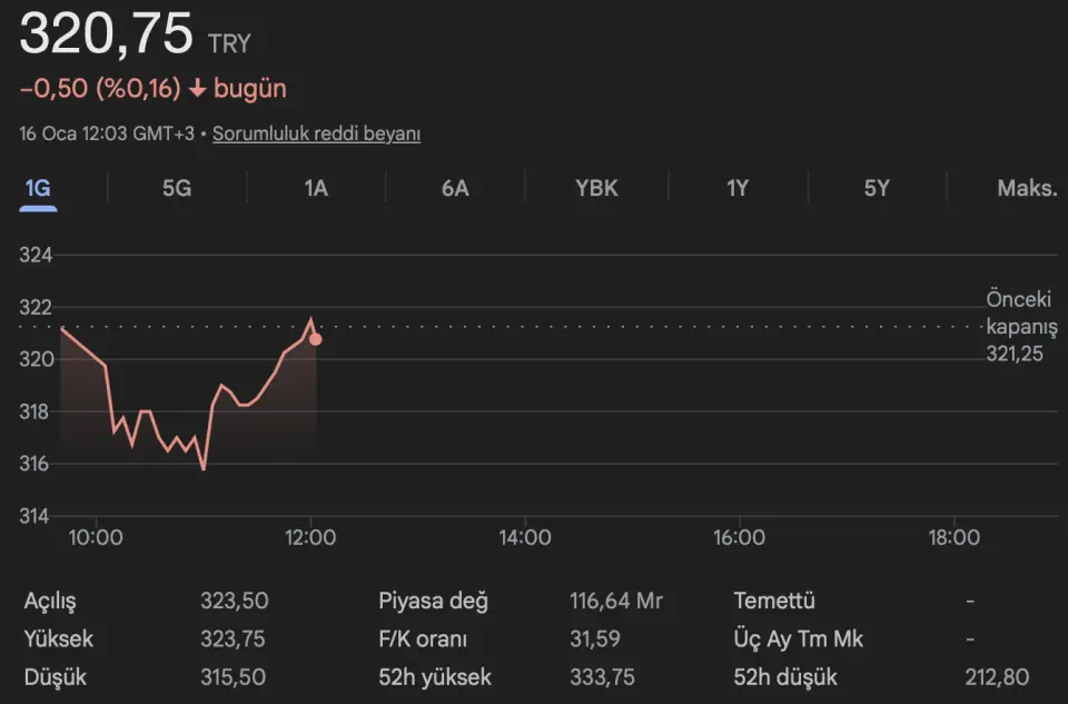 Kapanış (TL): 321.25- Hedef Fiyat (TL): 443.75 - Piyasa Deg. (TL): 116704 - 3A Ort. İşl. Hac.(mn$) : 15.39