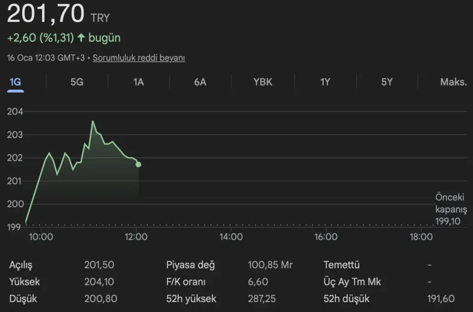 Kapanış (TL): 199.1 - Hedef Fiyat (TL): 300 - Piyasa Deg. (TL): 99550-3A Ort. İşl.Hac.(mn$): 87.48