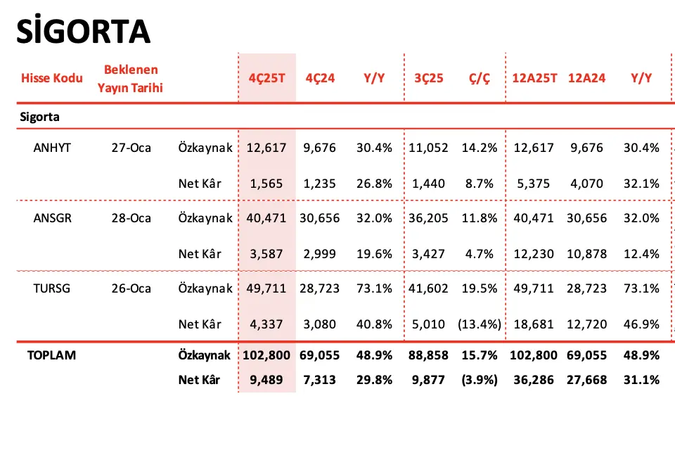 - "Sigorta şirketlerinde 4Ç25 sonuçlarında hayat/emeklilik tarafı ön plana çıkıyor: Türkiye Sigorta’da finansal gelirlerdeki gerilemeyle beraber net karında ç/ç %13’lük düşüş beklentimiz nedeniyle araştırma kapsamındaki üç sigorta şirketi için toplam net kârın %3,9 daralmasını bekliyoruz. Anadolu Hayat’ta hayat segmentindeki güçlü performans ve finansal gelirlerdeki artış sayesinde çeyreklik %9’luk net kar artışı beklerken, Anadolu Sigorta’da da finansal gelirlerle desteklenen %5 çeyreklik net kar artışı tahmin ediyoruz."