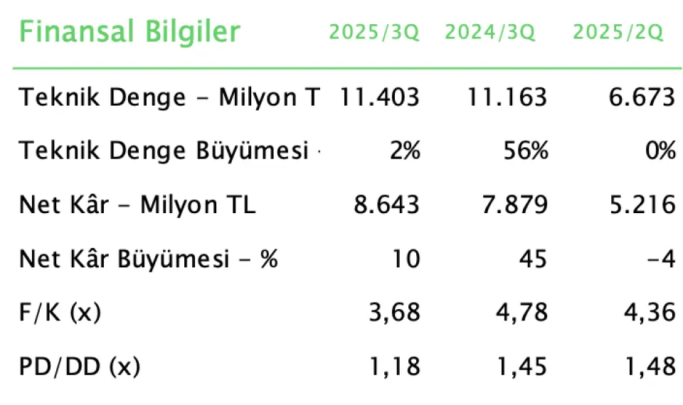 Anadolu Sigorta, 2025’in ilk dokuz ayında pazar payını koruyarak ve enflasyonun üzerinde prim büyümesi sağlayarak güçlü ticari performansını sürdürdü. Ancak artan hasar maliyetleri, faaliyet giderlerindeki yükseliş ve iskonto oranındaki düşüş, teknik kârlılığı sınırladı. Net kâr artışı ise büyük ölçüde yatırım portföyündeki genişleme ve yüksek faiz/kur ortamının desteklediği yatırım gelirleri sayesinde sağlandı.