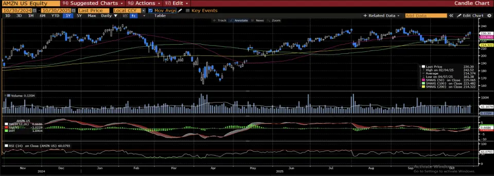 Amazon.com, Inc. (AMZN) hissesi hafta başında 226,97 USD seviyesinden kapanış yaptıktan sonra, hafta boyunca 229,25 USD ve 230,30 USDseviyelerine yükselerek istikrarlı bir yukarı yönlü seyir izledi. Hisse fiyatının 50, 100 ve 200 günlük üssel hareketli ortalamaların üzerinde kalması, kısa ve uzun vadede yükseliş trendinin korunduğuna işaret ediyor.