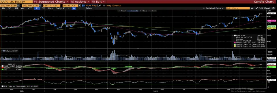 Apple Inc. (AAPL) hissesi hafta başında 268,81 USD seviyesinden kapanış yaptıktan sonra, 269,00 USD ve 269,70 USD seviyelerine kadar yükselerek hafta boyunca yavaş ama istikrarlı bir yükseliş trendi gösterdi. Hisse şu anda 50, 100 ve 200 günlük üssel hareketli ortalamaların üzerinde seyrediyor, bu da kısa ve uzun vadeli güçlü bir yükseliş momentumuna işaret ediyor.