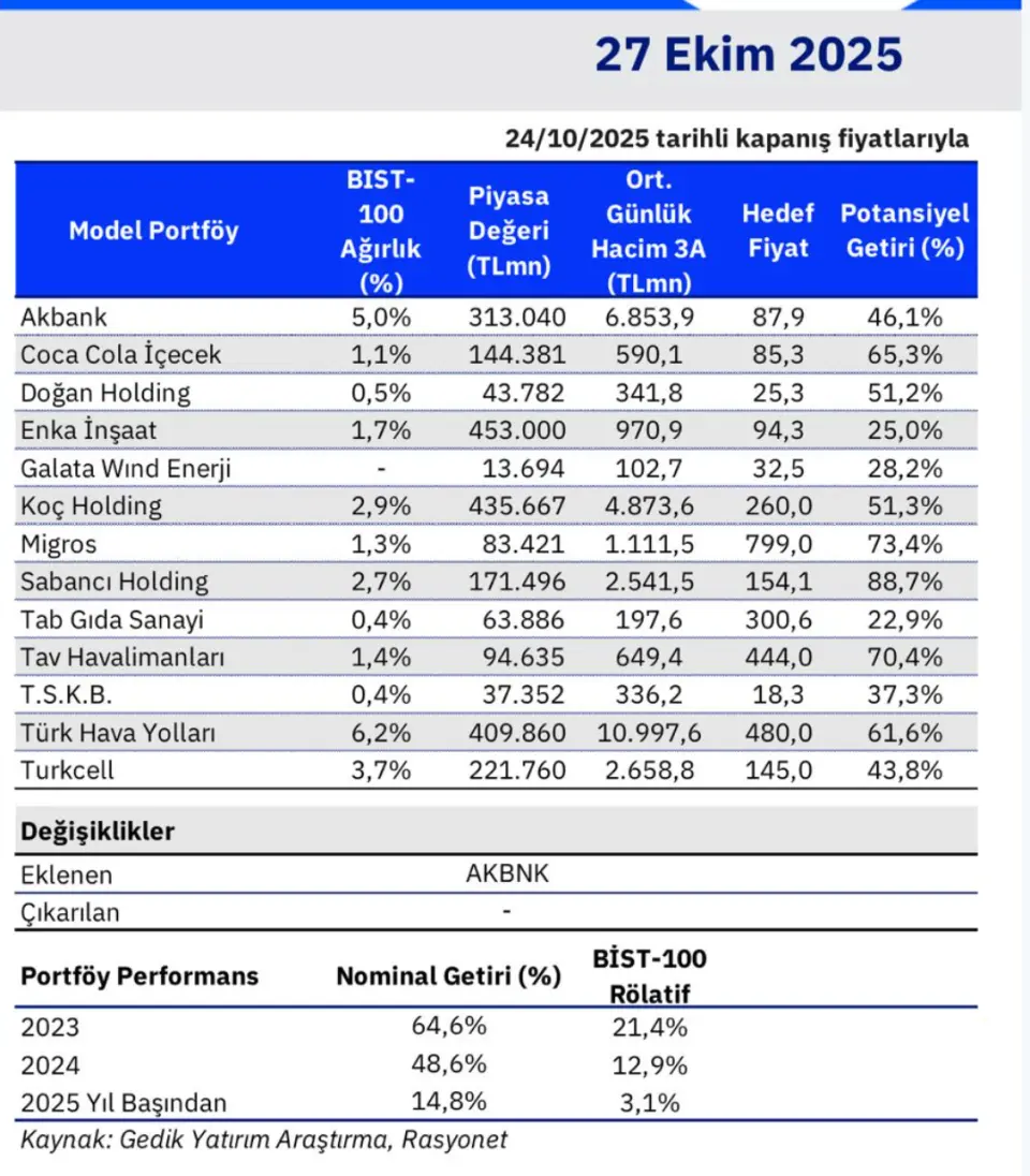 Gedik Yatırım 27 Ekim 2025 tarihinde bir rapor yayınladı Aracı kurum yayınladığı raporda Akbank (AKBNK) hissesine değindi. Aracı kurum model portföyüne AKBNK'ı eklediğini ve portföyündeki bankacılık hissesi ağırlığını ekim ayı fain indirimi sonrası artırdığını açıkladı. Şirket, raporunda şu ifadelere yer verdi: