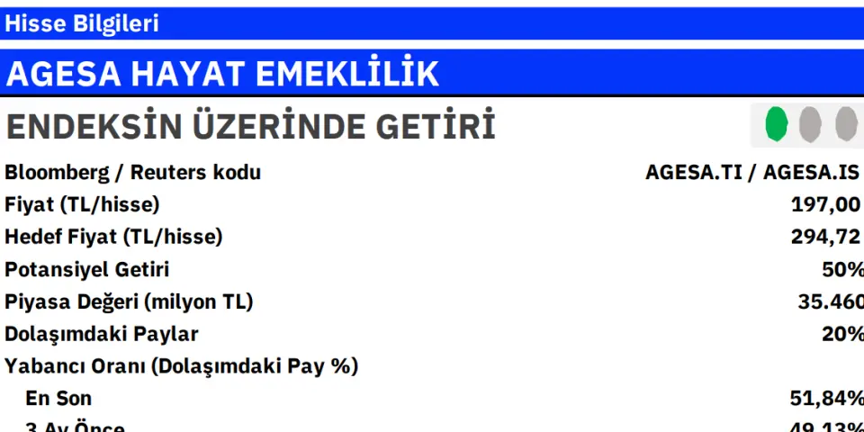 AgeSA Hayat ve Emeklilik, Sabancı Holding ve Ageas ortaklığıyla Türkiye’nin önde gelen bireysel emeklilik ve hayat sigortası şirketlerinden biridir. 2025 Eylül itibarıyla bireysel emeklilik fon büyüklüğünde %19,5, toplam prim üretiminde %13,7 pazar payı ile sektör liderliğini sürdürmektedir. Şirketin toplam aktif büyüklüğü 353 milyar TL’ye ulaşmıştır. Kar havuzunun yaklaşık yarısının döviz bazlı ürünlerden oluşması, doğal bir koruma sağlayarak kur hareketlerine karşı karlılığın dayanıklılığını artırmaktadır. Çeşitlendirilmiş yapısı, çok kanallı dağıtım ağı, dijital dönüşüm vizyonu ve Akbank ile yürüttüğü münhasır bankasürans iş birliği şirketin güçlü büyüme ivmesini desteklemeye devam etmektedir. Ayrıca genişleyen doğrudan satış ekibi, müşteri etkileşimini güçlendirerek bankacılık dışı kanallardan yeni iş fırsatlarının yakalanmasını sağlamaktadır.