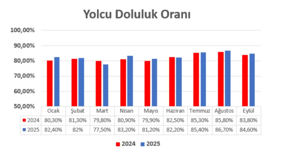 Türk Hava Yolları eylül ayında toplam yolcu sayısını %12,9 artırarak 8.675.298 adet yolcu taşıdı. Yolcu sayısındaki artışa iç hat büyümesi öncülük etti. Yurt içinde toplam yolcu sayısı yıllık bazda %19,1 artışla 3.184.825’e ulaştı. Dış hat tarafında ise geçen yılın aynı dönemine göre %9,7 artışla 5.490.473 yolcu taşındı. Bu dönemde kapasite kullanım oranı 0,8 puan artışla %84,6’ya ulaştı. Kapasite kullanımı iç hatlarda %88,6 ile 0,2 puan azalırken, dış hatlarda 0,8 puan artışla %84,1 oldu. Arz Edilen Koltuk KM (AKK) %7,6 artış gösterdi. Kargo tarafı ise eylülde yıllık %7,4 büyüdü.