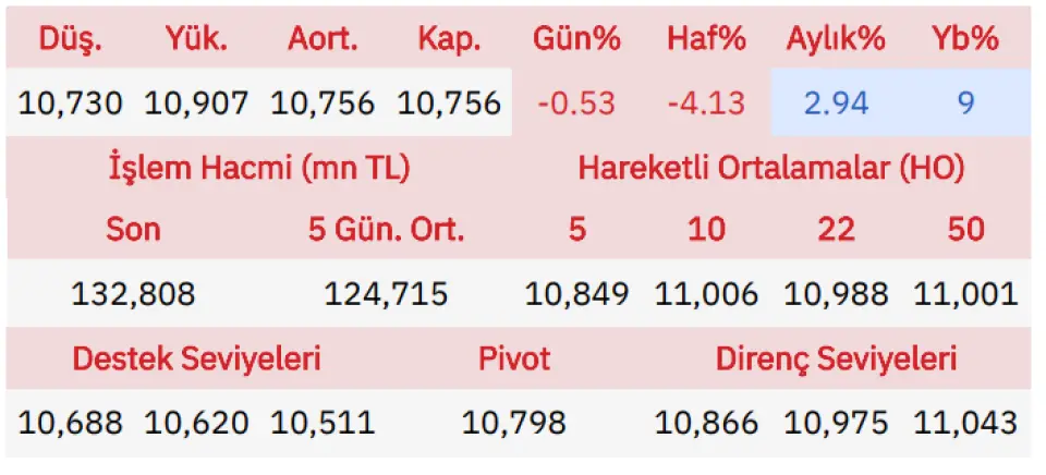 Ulusal 100 endeksinde, geçtiğimiz gündeki işlem aktivitesi 10730 - 10907 seviyeleri arasında gerçekleşti ve önceki güne göre yüzde 0.53 düşüşle (-57.84 puan) kapandı. Endekste destek ve direnç olarak 10688 ve 10866 seviyelerini takip edeceğiz. 200 günlük ortalamanın üzerinde olmamız trend için önemli, olası düşüşlerde ortalama seviyesinin altına inmediğimiz sürece alım fırsatı olarak görüyoruz.