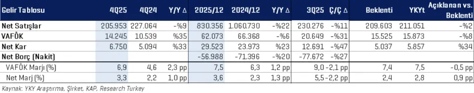 4Ç25’te net satış gelirleri bizim 211,1 milyar TL beklentimiz ve piyasanın 209,6 milyar TL beklentisinin hafif altında y/y %9 düşüşle 206,0 milyar TL oldu. 4Ç25’te %93 kapasite kullanım oranı ile 6,7mn ton üretim yapıldı. Satış hacmi ise 7,5mn ton (y/y yatay) oldu.