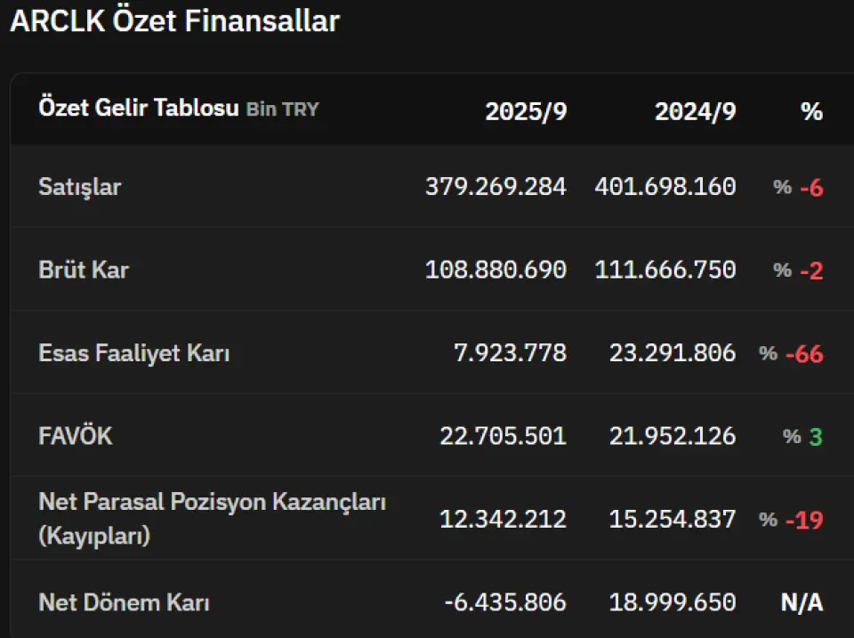 ARCLK geçen yıl 3. çeyrek bilançosunda 18.999.650.000 TL kar rakamı açıklamıştı. Şirket bu yıl 3. çeyrekte ne yazık ki zarara geçerek 6.435.806.000 TL zarar rakamı açıkladı.