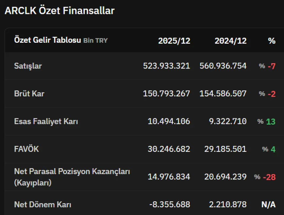 ARCLK’in 2025 4. Çeyrekte 128,1 mlr TL hasılat, 6,55 mlr TL FAVÖK, 1,64 mlr TL net zarar ile konsensus beklentilerine paralel sonuçlar açıkladığını görmekteyiz.