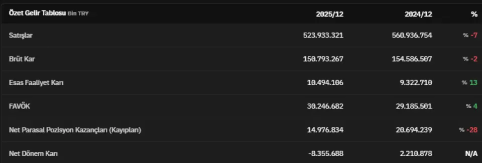 FAVÖK 2025 yılının 4. çeyreğinde 30.246.682.000 TL olarak açıklandı. 2024 yılının 4. çeyreğinde 29.185.501.000 TL olarak açıklanan FAVÖK 2025 yılının 4. çeyreğinde %4 artmış oldu. Net parasal pozisyon kazançları 2025 yılının 4. çeyreğinde 14.976.834.000 TL olarak kaydedildi. Net dönem kârı ise -8.355.688.000 TL olarak kaydedildi. İlgili veri 2024 yılının 4. çeyreğinde 2.210.878.000 TL olarak açıklanmıştı.