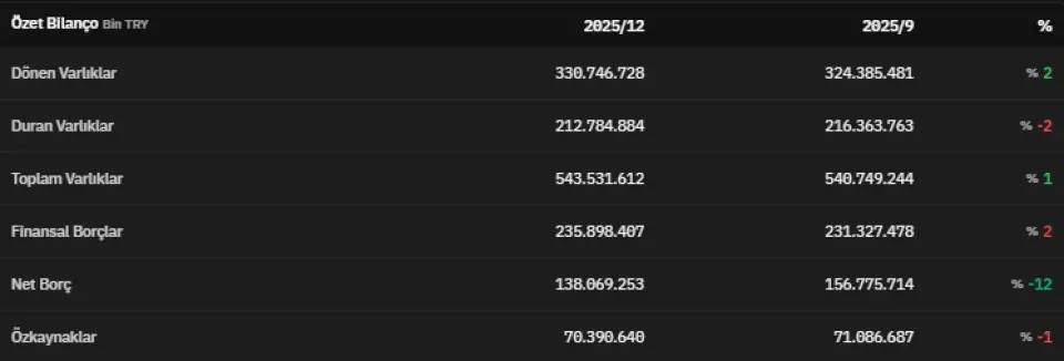 Dönen varlıklar 2025 yılının 4. çeyreğinde 330.746.728.000 TL olmuştur. 2025 yılının 4. çeyreğinde 212.784.884.000 TL olarak açıklanan duran varlıklar, 2025 yılının 3. çeyreğinde 216.363.763.000 TL olarak açıklanmıştı. Toplam varlıklar 4. çeyrekte 543.531.612.000 TL olarak kaydedildi.
