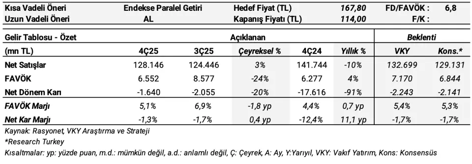 Vakıf Yatırım ARCLK finansalları için "Arçelik'in 2025 yılının son çeyreğinde, yurtiçinde dezavantajlı ürün karması ve fiyatlaması, uluslararası pazarda süregelen zayıf talep ve Avrupa’da yoğunlaşan rekabetin etkisiyle satış gelirlerinde yıllık bazda %9,6 azalarak 128,1 mlr TL seviyesinde gerçekleşti." ifadesini kullandı.