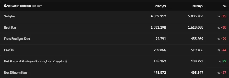 FAVÖK 2025 yılının üçüncü çeyreğinde 289.866.000 TL olarak açıklandı. Net parasal pozisyon kazançları 2025 yılının üçüncü çeyreğinde 165.257.000 TL olarak kaydedildi. 2024 yılının üçüncü çeyreğinde 130.273.000 TL olarak açıklanan net parasal pozisyon kazançları, 2025 yılının üçüncü çeyreğinde %27 artmış oldu. Net dönem kârı ise -478.572.000 TL olarak kaydedildi.