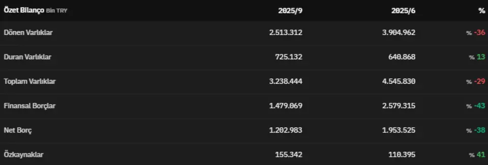 Dönen varlıklar 2025 yılının üçüncü çeyreğinde 2.513.312.000 TL olmuştur. 2025 yılının üçüncü çeyreğinde 725.132.000 TL olarak açıklanan duran varlıklar, 2025 yılının ikinci çeyreğinde 640.868.000 TL olarak açıklanmıştı. Toplam varlıklar üçüncü çeyrekte 3.238.444.000 TL olarak kaydedildi. Finansal borçlar 2025 yılının üçüncü çeyreğinde 1.479.069.000 TL olarak kaydedildi.