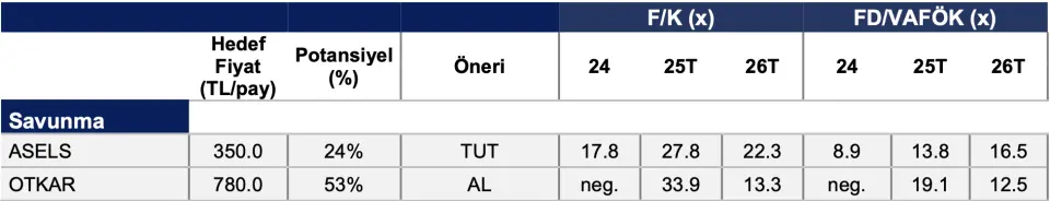 - "Aselsan, bu harcama patikasının temel faydalanıcılarından biri olmaya devam etmektedir. Öte yandan Otokar’ın 4Ç25’te Romanya’ya yapacağı teslimatlarla birlikte finansallarında güçlü görünüm beklemekteyiz. Bu doğrultuda, savunma sektörü 2025’te olduğu gibi 2026’nın da öne çıkan sektörlerinden biri olmaya devam etmektedir."