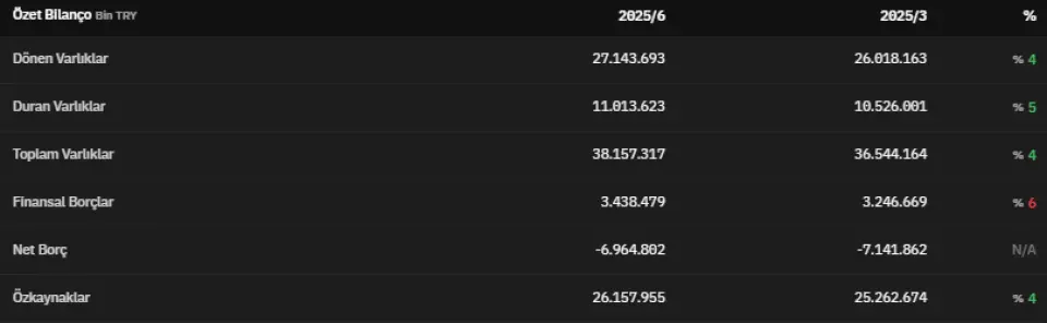 Dönen varlıklar 2025 yılının ikinci çeyreğinde 27.143.693.000 TL olmuştur. 2025 yılının ikinci çeyreğinde 11.013.623.000 TL olarak açıklanan duran varlıklar, 2025 yılının ilk çeyreğinde 10.526.001.000 TL olarak açıklanmıştı. Toplam varlıklar 2025 yılının ikinci çeyreğinde 38.157.317.000 TL olarak açıklanmıştır. Finansal borçlar 2025 yılının ikinci çeyreğinde 3.438.479.000 TL olarak açıklandı. 2025 yılının ikinci çeyreğinde net borç -6.964.802.000 TL olarak açıklandı. Özkaynaklar 2025 yılının ikinci çeyreğinde 26.157.955.000 TL olarak duyurulmuştur.