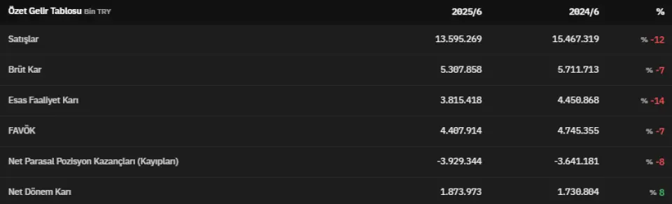 Şirket 2025 yılının ikinci çeyreğinde 13.595.269.000 TL satış gerçekleştirmiştir. 2024 yılının aynı dönemine oranla satış geliri %12 azalmıştır. 2024 yılının ikinci çeyreğinde satışlar 15.467.319.000 TL olarak kayıtlara geçmişti. 2025 yılının ikinci çeyreğinde brüt kar 5.307.858.000 TL olarak açıklanmıştır. 2024 yılının ikinci çeyreğinde ise bu veri 5.711.713.000 TL olarak açıklanmıştı.  Esas faaliyet karını 3.815.418.000 TL olarak açıklayan şirket, 2024 yılının ikinci çeyreğinde esas faaliyet karını 4.450.868.000 TL olarak açıklamıştı.
