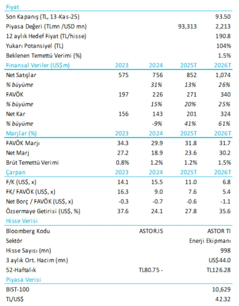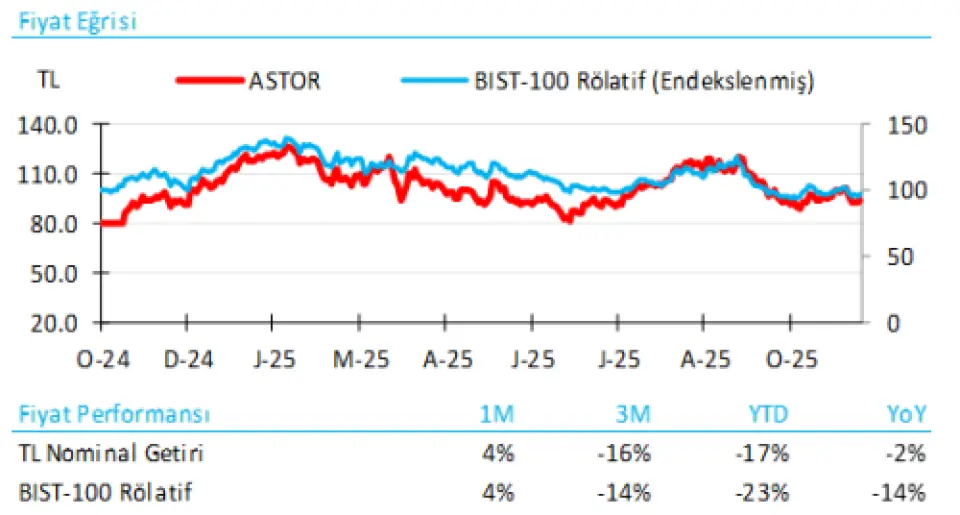 14 Kas 2025 Astor 3Ç25 sonuçları: Astor’un 3Ç25 sonuçlarını, operasyonel zayıflığın büyük ölçüde fiyatlanmış olduğu dikkate alındığında, genel olarak beklentilerle uyumlu değerlendiriyoruz. Yeni üretim tesisinin geciken kapasite artışı kısa vadeli projeksiyonlarımızı aşağı çekmemize neden olsa da, tesisin tam devreye alınacağı 2026 itibarıyla belirgin bir toparlanma öngörüyoruz. ABD’de ölçeklenme ve Ukrayna’da potansiyel ihale kazanımları orta vadeli görünümü destekleyen unsurlar arasında. 2025 gelir tahminimizi, şirketin güncellenen beklentileriyle paralel şekilde, %7 düşürerek 852mn dolara (+%13 y/y) revize ettik. 2026 için yeni fabrikanın %60 kapasite kullanım oranı varsayımıyla gelir tahminimizi %10 aşağı çekerek yaklaşık 1.1myr dolara (+%26 y/y) indirdik. FAVÖK tahminlerimizi ise 2025 için %7, 2026 için %12 düşürdük. Revizyonların temel nedeni yurt içi fiyat rekabeti olurken; daha düşük enerji maliyetleri, şirket içi bakır tel üretimi ve yeni tesisin avantajları sayesinde her iki yılda da yaklaşık %32 seviyesinde istikrarlı FAVÖK marjı öngörüyoruz. Global emsal çarpanlarındaki artışa rağmen, Astor’un henüz gelişme aşamasında olan iş modelini yansıtmak adına hedef çarpanlara uyguladığımız iskontoyu %30’dan %40’a çıkardık. Aşağı yönlü tahmin revizyonlarımızla birlikte hedef fiyatımızı %9 azaltarak TL190.8’e indiriyoruz; bu seviye %104 getiri potansiyeline işaret ediyor. Endeks üstü getiri görüşümüzü koruyoruz.