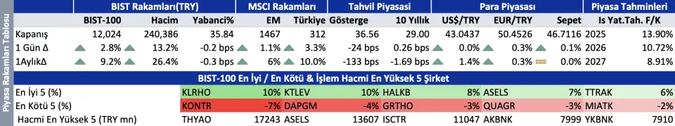 ABD vadelilerinin ve Asya borsalarının seyri Borsa İstanbul’da yatay bir açılışa işaret ediyor. Ama dün akşam vadeli piyasanın seyri yükselişin devam edeceği sinyali veriyor. İşlem hacmindeki yükseliş, açık pozisyondaki önceki haftaya göre artış, tahvil ihalelerine gelen güçlü talep yükselişi destekliyor. Güçlü hafif ticari araç satışı Ford Otosan’ı olumlu etkiler. Bireysel emeklilik sistemine devlet katkısının azalması hayat sigortası şirketlerini sınırlı olumsuz etkileyebilir. Hisse senedine yönelik iştahta bozucu etki yaratmasını beklemiyoruz. Altın fiyatlarındaki düşüş Koza Altın ve Gübre Fabrikaları’nı sınırlı olumsuz etkileyebilir. Endeks için destek ve direnç seviyeleri 11.900 ve 12.175.