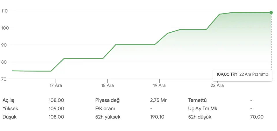 Önceki haftanın son işlem gününü de TAVAN bitiren hisselerden AKIN TEKSTİL A.Ş. (ATEKS), yeni haftanın ilk işlem gününde de TAVAN'a kilitlendi. ATEKS hissesi, 19 Aralık 2025 tarihinde saat 13.00'da 99,10 TL ile TAVAN olmuştu. Günü %10 değer kazanımı ile bitiren hisse, 22 Aralık 2025'teki işlem gününde yine saat 13.00'da TAVAN'a kitlendi ve 109 TL'yi gördü.