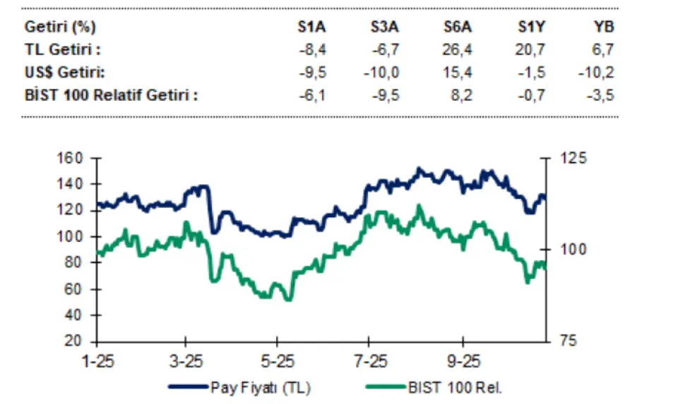 Açıklanan 3Ç25 finansal sonuçlarını, beklentinin üzerinde gerçekleşen net kar ve yıl sonu beklentilerinde yapılan genel anlamda olumlu güncellemeler doğrultusunda “Pozitif” olarak değerlendiriyoruz. 2025-2026 net kar tahminlerimizde yaptığımız yukarı yönlü revizyonlar sonucunda, 164,5 TL olan hedef fiyatımızı 172,3 TL olarak güncelliyoruz. Yeni hedef fiyatımız, mevcut seviyelere göre %35 yükseliş potansiyeline işaret etmekte olup, “Al” tavsiyemizi koruyoruz. 2025 yılında %28,5 kar artışı modelliyoruz. Hisse 2025T 4,5x F/K ve 1,3x F/DD çarpanlarıyla ve %31,8 ortalama özkaynak getirisiyle işlem görmektedir.