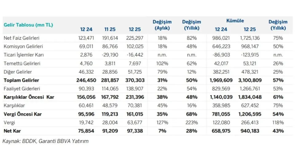 "Bankacılık sektörünün Aralık 2025 net karı 97.3mlr TL olarak gerçekleşti. (yoy:+28%, mom: +7%) Böylece, 2025 yılında toplam net kar 940.2mlr TL oldu (yoy:+43%) (Özkaynak karlılığı: %27.6). 4Ç25’de sektörün net karı aylık ortalamada çeyreksel bazda %9 arttı. Operasyonel gelirlerin %18 arttığı ayda, artan operasyonel ve vergi giderleri net karı baskıladı. Kredi mevduat makası aylık bazda 53 baz puan daralırken, net faiz marjı artan menkul kıymet getirileri neticesinde 84 baz puan genişledi ve %6.7 oldu. Öne çıkan başlıklar şu şekildedir; Komisyon gelirleri aylık bazda %18 artarken, yıllık bazda ise %50 artarak geçtiğimiz yıldan süregelen kuvvetli görünümünü sürdürdü. Önceki ayda, 29.2mlr TL olan ticari işlemler zararı, bu ay 16.4mlr TL zarar olarak gerçekleşti ve net karı destekledi. Sektörün net karşılıkları aylık bazda %5 azaldı. Takip rasyosu aylık bazda 5 baz puan artarak %2.5 oldu. 2025 yılı kümüle net risk maliyeti +55bps oldu. (2024: -53bps). Bu veri ile yılın son çeyreğinde sektör dinamiklerinin nasıl şekillendiğini görmüş olduk.