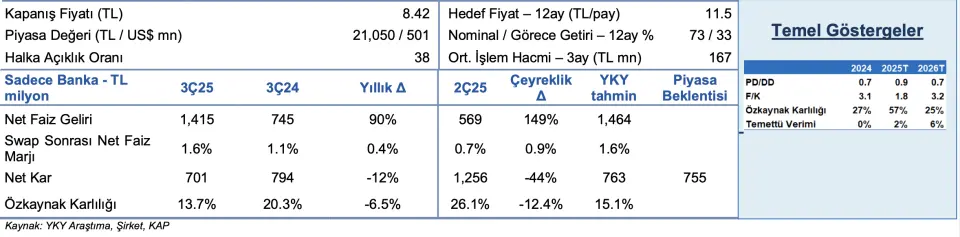 - "3. çeyrekte banka, TL kredilerde çeyreklik %7, yabancı para kredilerde ise $ bazında %6 büyüdü. Takipteki kredi oranı çeyreklik 20 baz puan arttı ve %1.7 seviyesinde. Takibe girişlerde hızlanma gözlemledik. Takipteki kredilerin toplam karşılık oranı %148 seviyesine geriledi (2Ç25: %180). 2. aşama (yakın izleme) kredilerin toplam krediler içindeki payı %6.6 seviyesine geriledi (2Ç25: %6.6)."