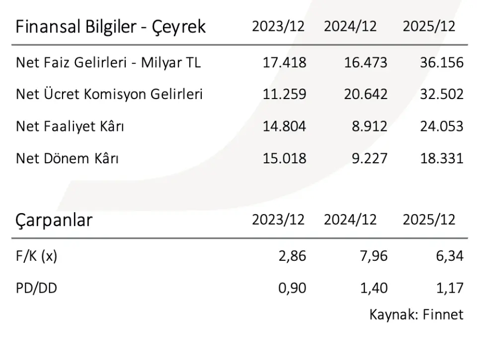 Net faiz gelirleri ve marj tarafında toparlanma eğiliminin güçlendiğine dikkat çeken aracı kurum, swap dahil net faiz gelirlerinin 38,3 milyar TL seviyesinde gerçekleşerek hem çeyreklik hem de yıllık bazda artış gösterdiğini belirtti. Kurum, artan TL kredi-mevduat makası ve fonlama tarafındaki normalleşmenin etkisi ile net faiz gelirlerindeki yükselişi, net faiz marjında toparlanmanın somut bir yansıması olarak gördü. 2025 yılı genelinde swap dahil net faiz marjı %2,5 seviyesinde gerçekleştiği de kaydedildi.