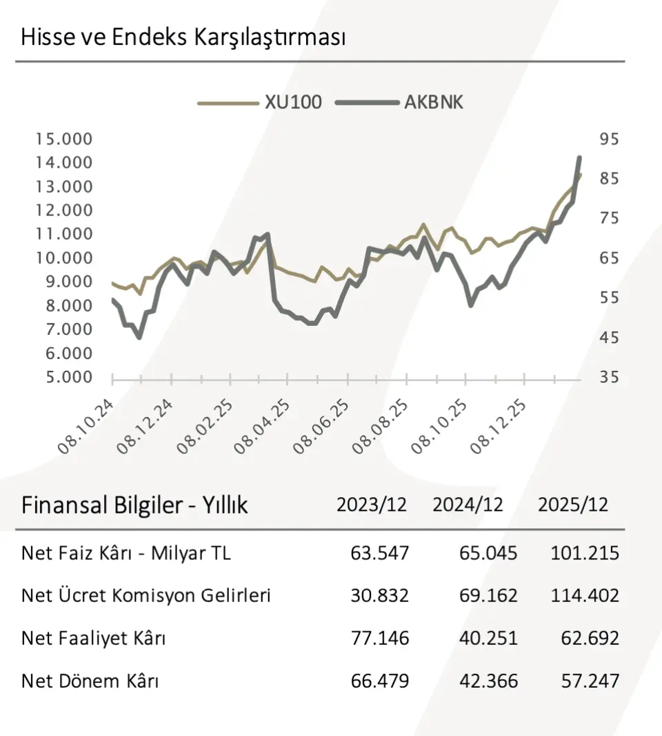 - "Akbank’ın 25Q4 finansalları, güçlü net faiz gelirleri ve net ücret-komisyon performansı sayesinde operasyonel kârlılığın sağlam bir zeminde ilerlediğini göstermektedir. Karşılık giderleri kârlılık üzerinde baskı yaratmaya devam etse de, bankanın güçlü sermaye yapısı, maliyet disiplini ve kontrollü risk profili bilanço kalitesini desteklemektedir."