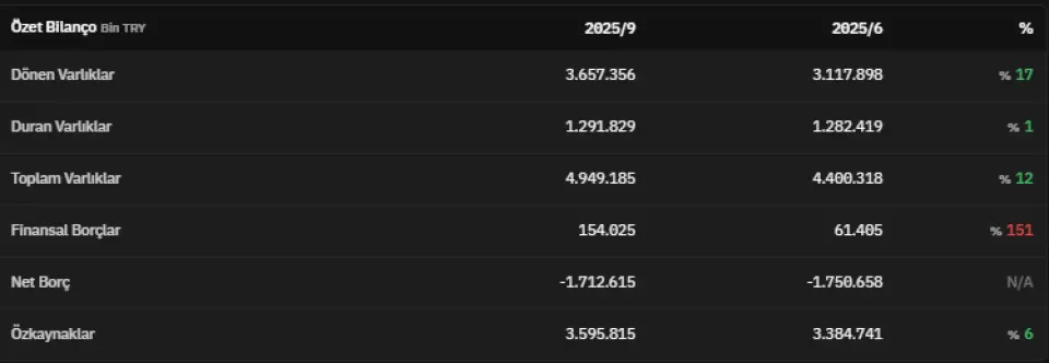 Dönen varlıklar 2025 yılının üçüncü çeyreğinde 3.657.356.000 TL olmuştur. 2025 yılının üçüncü çeyreğinde 1.291.829.000 TL olarak açıklanan duran varlıklar, 2025 yılının ikinci çeyreğinde 1.282.419.000 TL olarak açıklanmıştı. Toplam varlıklar üçüncü çeyrekte 4.949.185.000 TL olarak kaydedildi. Finansal borçlar 2025 yılının üçüncü çeyreğinde 154.025.000 TL olarak kaydedildi.